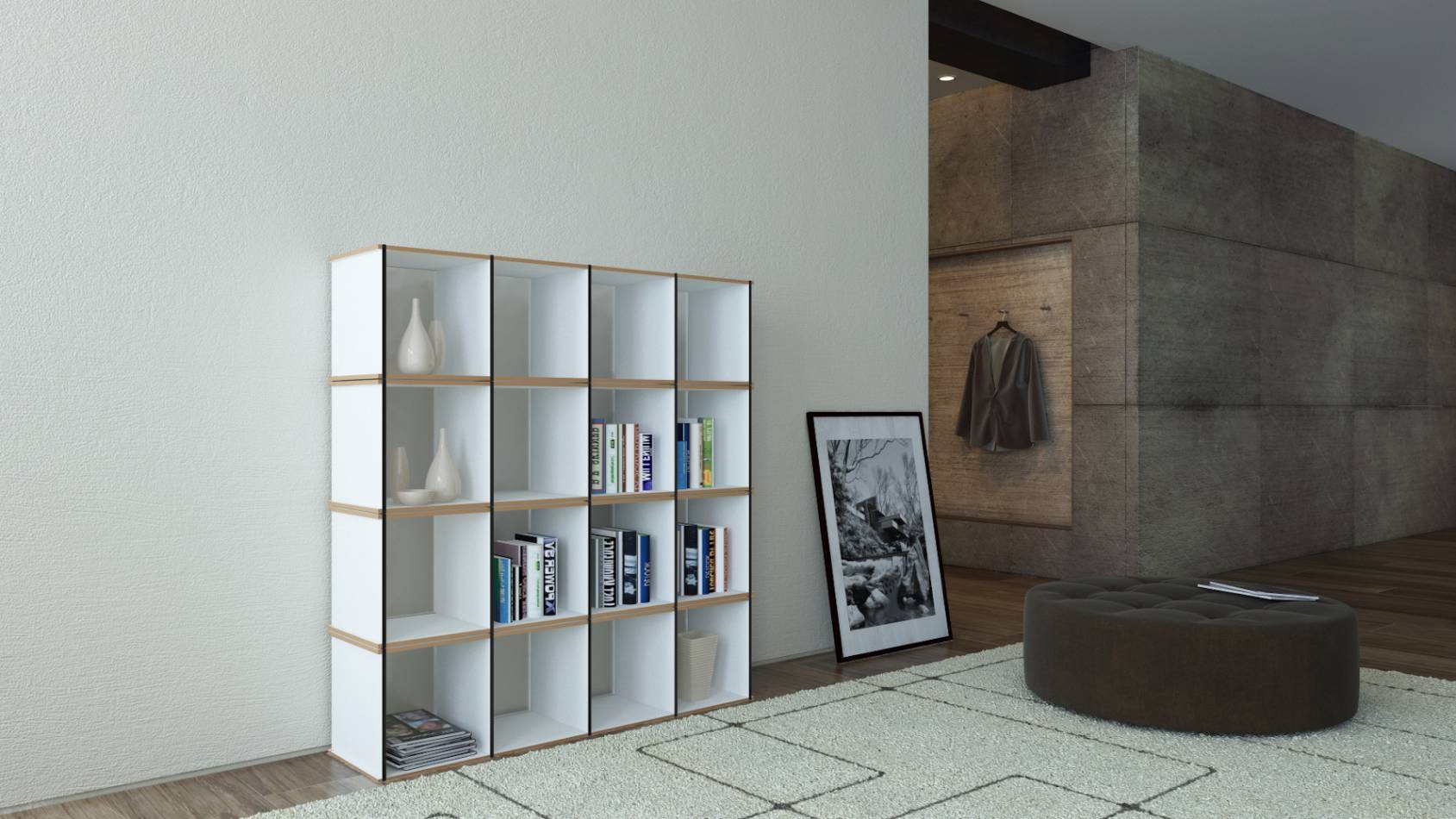 So geht funktionales Design. Der Designer Hartmut Ringel gab ihm eine puristische Form, erschuf die klare Konstruktion und ersann die pfiffige Handhabung des Tojo Aktenpack. Fünf umlaufende Spanngummis halten die Elemente. Zusammen mit der Rückwand aus Acrylglas bilden sie eines der Module für ein erweiterbares Regalsystem, das besonders gut als Raumteiler fungiert.Die Front besticht mit einer Holzkante im Kontrast zu den weißen MDF-beschichteten Innenflächen und den umlaufenden schwarzen Ringen. Optisch filigran und doch hält das Tojo Aktenpack Regalmodul eine Menge aus.