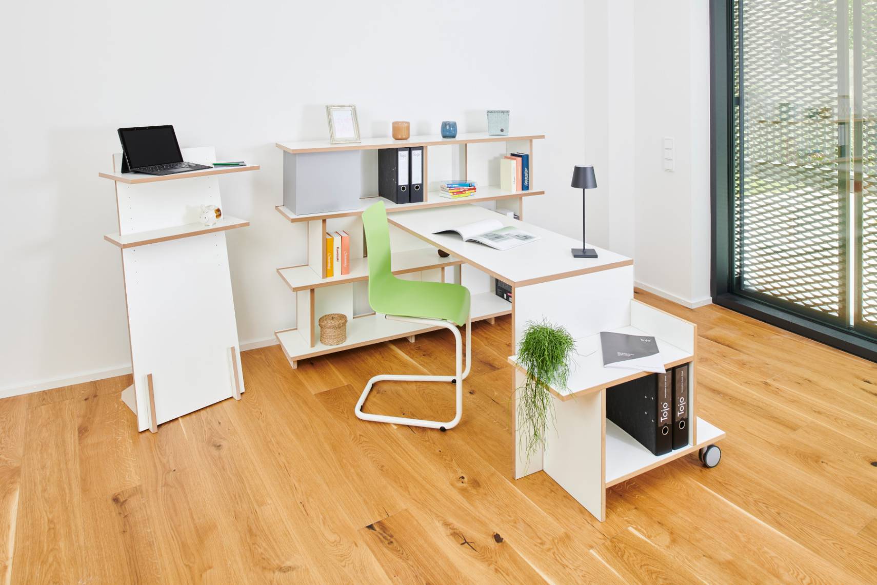 - Fahren Sie den Tojo Freund an die Stirnseite Ihres Schreibtisches. Da nimmt er all die kleine Dinge auf, die man mal schnell aus der Hand legen oder aus dem Blickfeld haben möchte. In die untere Ablagefläche passen sogar Ordner.
