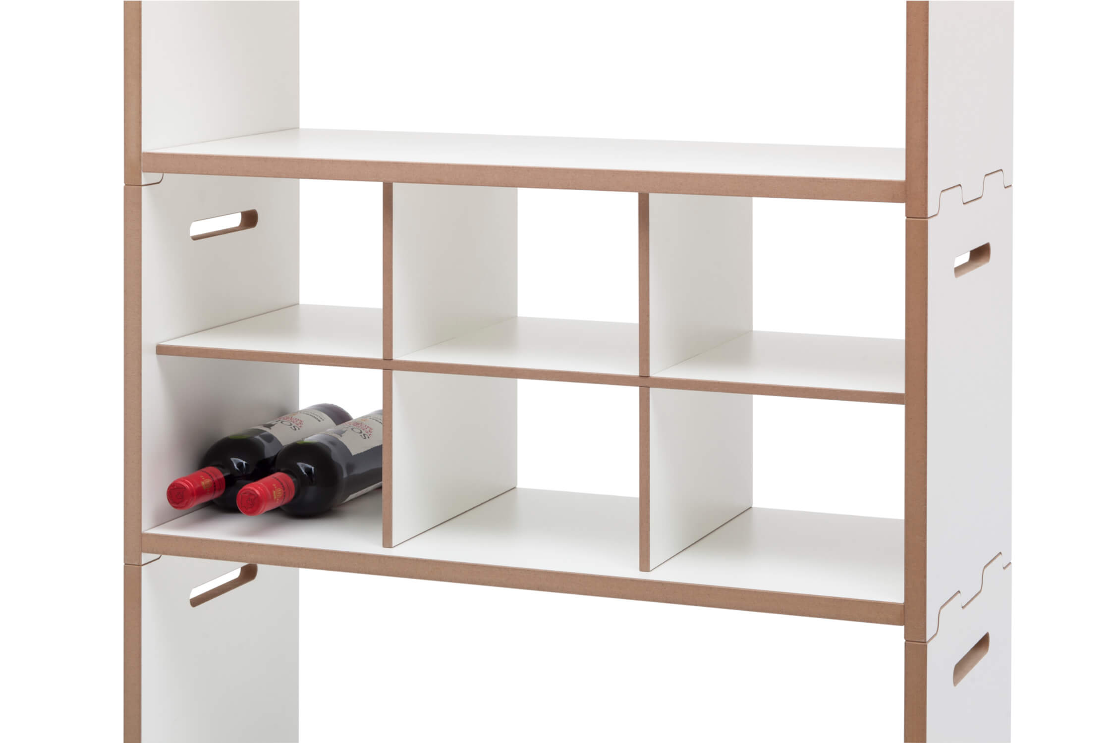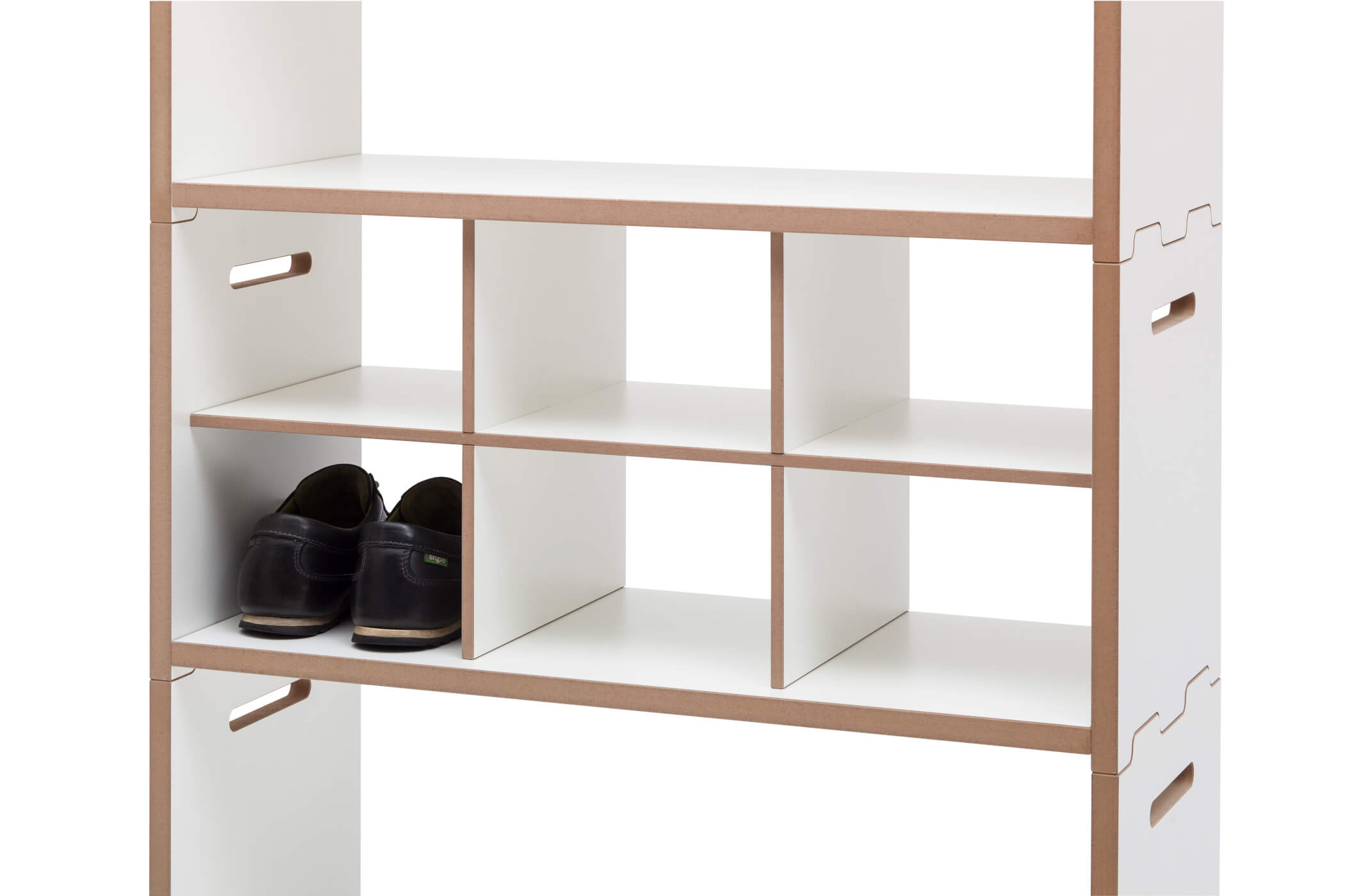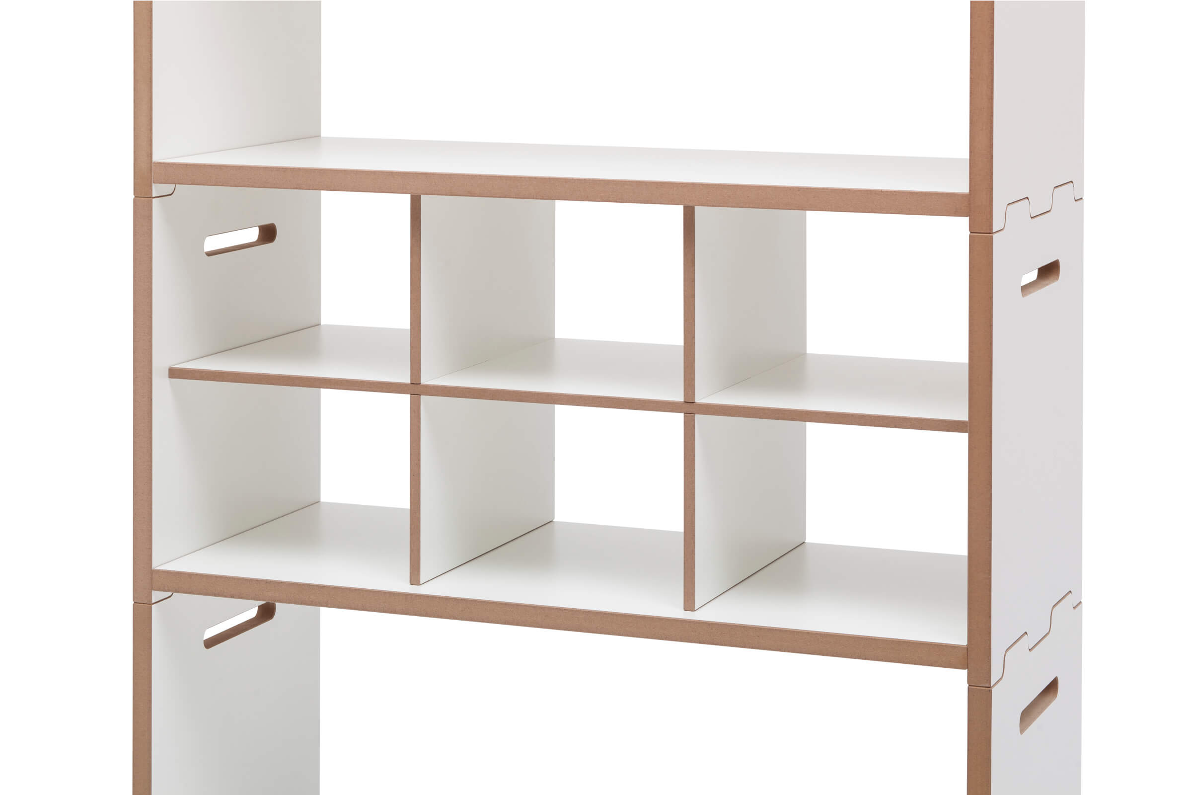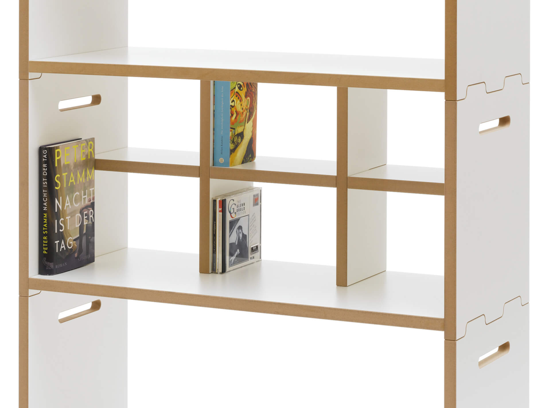 | Details: | Mit dem Tojo-Clip lassen sich die nebeneinander aufgestellten Regale miteinander verbinden. Er wird in die seitlichen Ausfräsungen eingesetzt. |