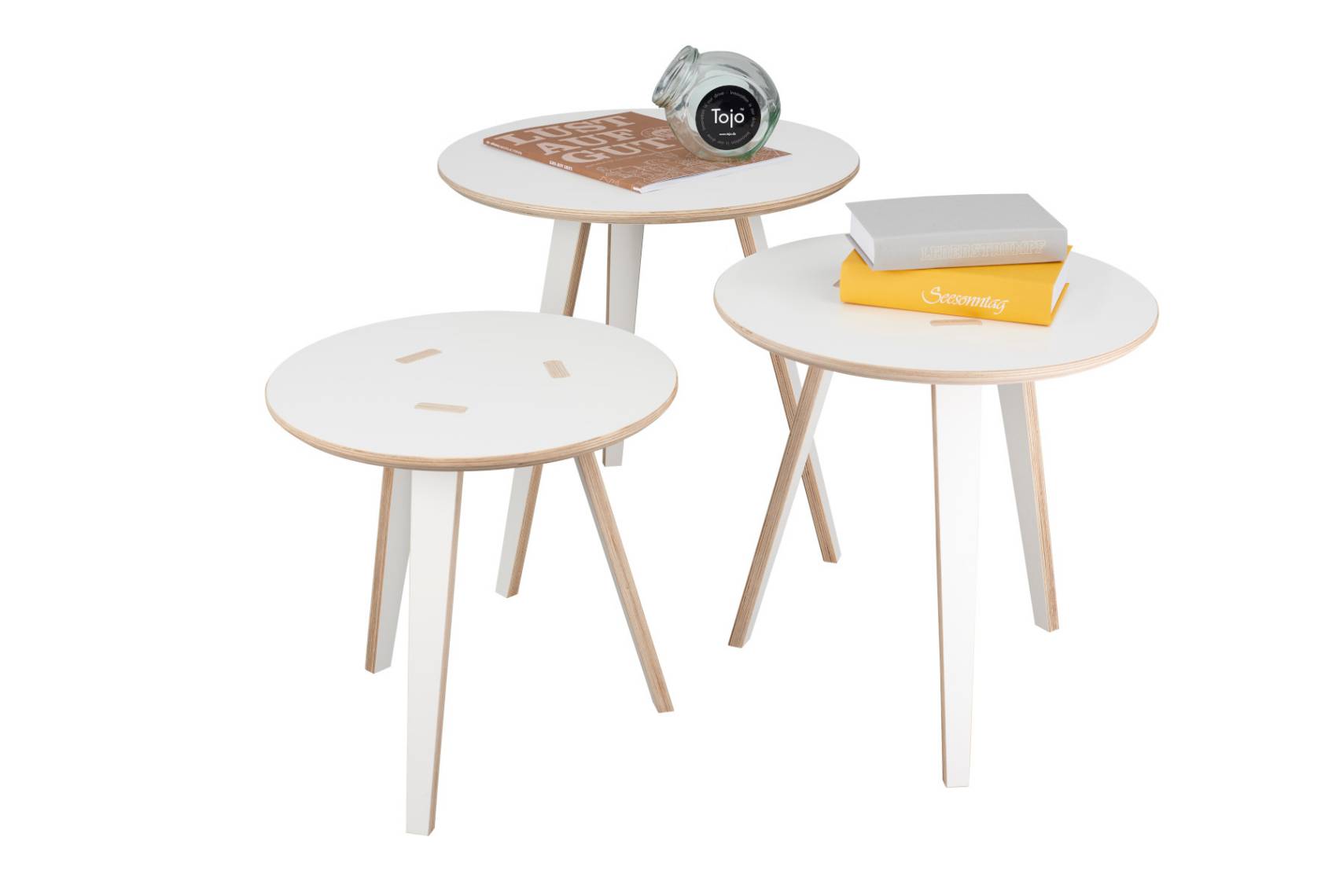 Der Aufbau ist denkbar einfach. Die fünf Teile (Tischplatte, drei Beine und Spannelement) fügen Sie mit wenigen Handgriffen zusammen. Ohne Werkzeug, dank der genialen Verspanntechnik.Das Designer Duo T. Herth und T. Schlüter ersann für Tojo mit dieser Beistelltisch Serie stabile Ablagetische aus robustem und pflegeleichtem Buche Multiplex.