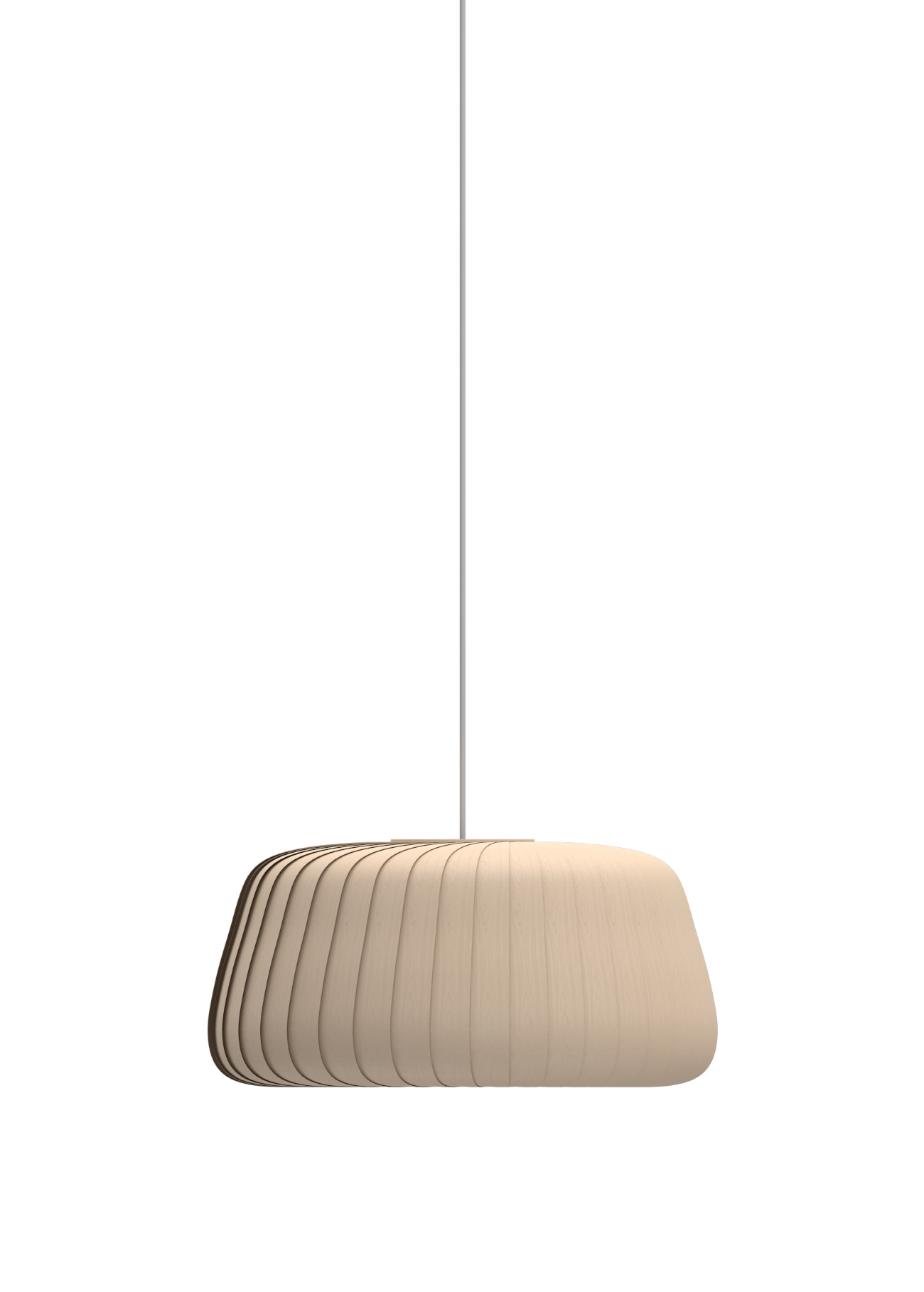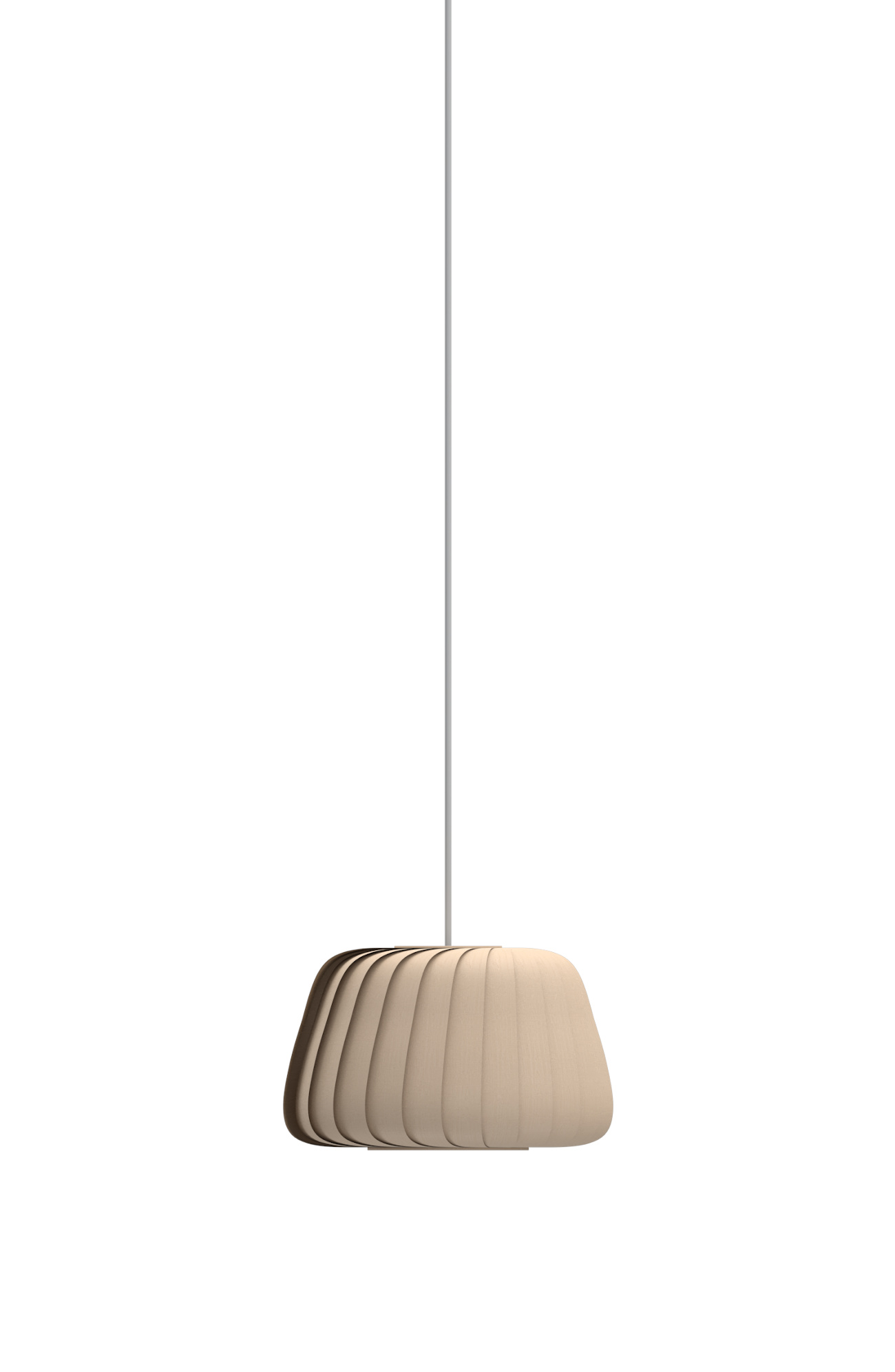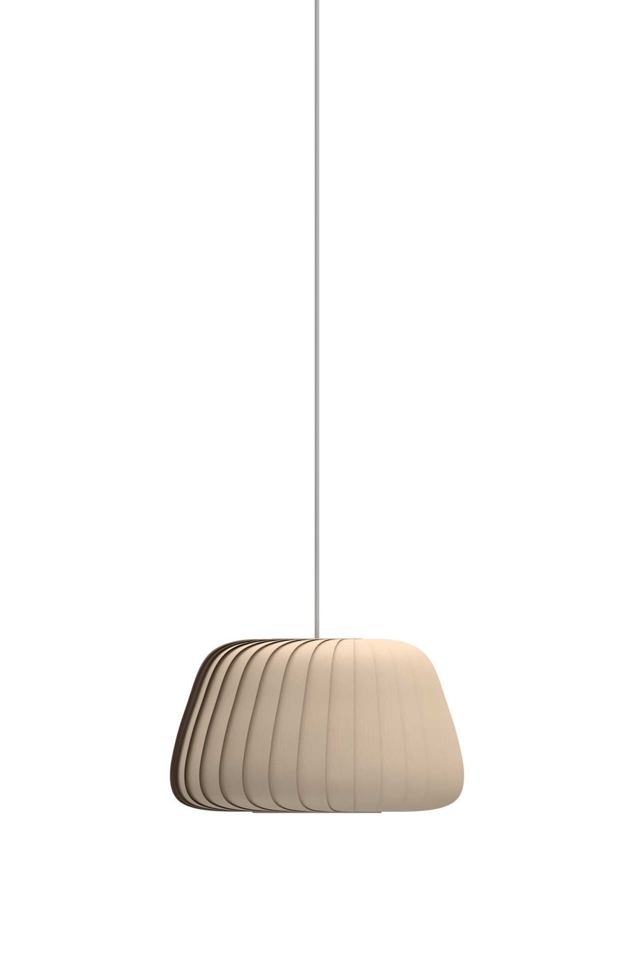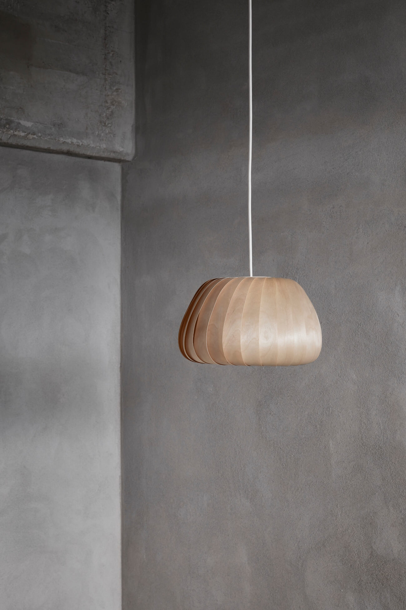 Gefertigt aus hochwertigen Birken- oder Walnussfurnieren, präsentiert sich die TR19 Pendelleuchte in verschiedenen Oberflächenausführungen und Farben. Designer Tom Rossau entwarf die Leuchte mit einer Größe von 40 x 23 cm, wobei sie neben mattem Weiß auch in natürlichen Holzfarben erhältlich ist. Die handgearbeitete Schirmstruktur sorgt für eine gleichmäßige und stimmungsvolle Lichtverteilung, während die filigran gearbeitete Aufhängung Stabilität und visuelle Leichtigkeit verleiht.