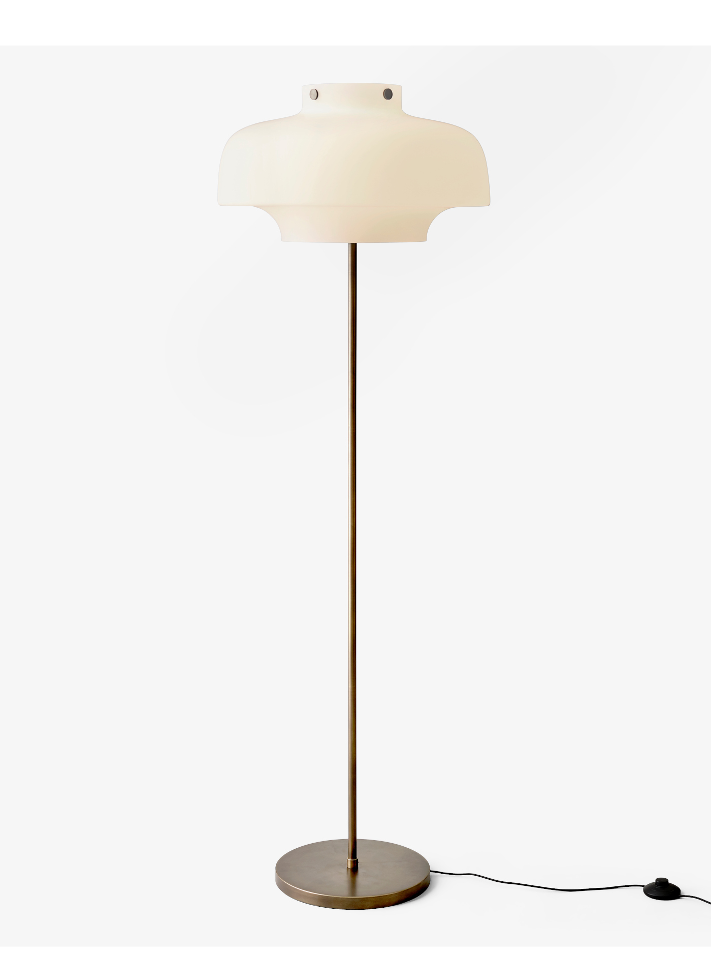 Gefertigt aus mundgeblasenem Opalglas und raffiniertem, bronziertem Messing, misst die Leuchte eine Höhe von 150 Zentimetern bei einem Durchmesser von 50 Zentimetern. Die integrierte, dimmbare LED-Technik garantiert ein angenehmes, warmes Lichtbild und wird den höchsten Ansprüchen an Qualität und Energieeffizienz gerecht. Designer Space Copenhagen ließ klassische Inspiration in eine stilprägende Neuinterpretation fließen.