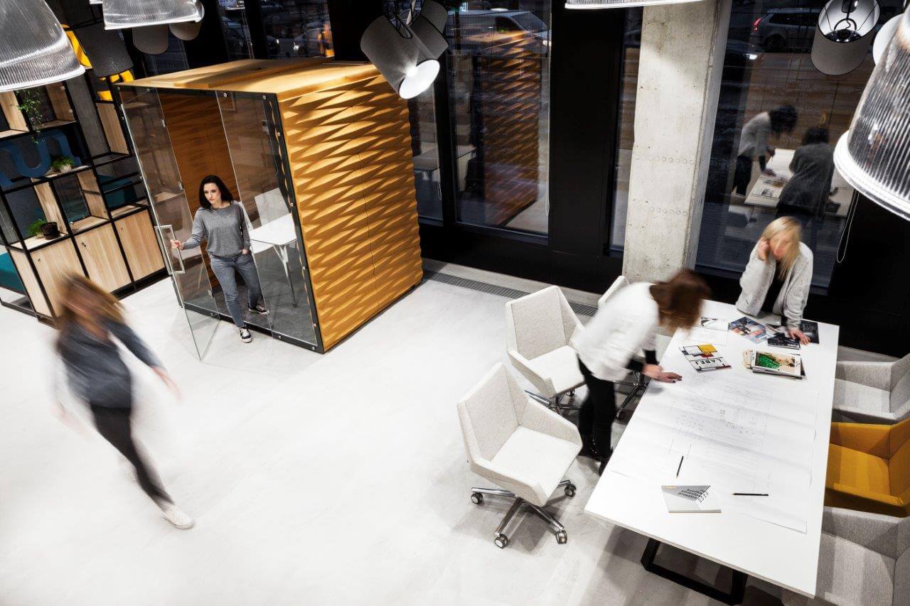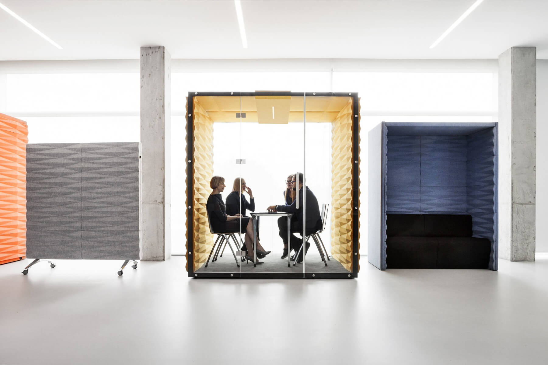 | Details: | Eine Raumaufteilung, die den Mitarbeitern Platz für Telefongespräche oder für Besprechungen bietet, verbessert den Arbeitskomfort von Einzelpersonen und Teams in Großraumbüros und, fördert ihre Kreativität. Die 2/3-, 4- und 6- Personen-Akustikboxen wurden entwickelt, um dank ihrer speziellen Konstruktion Gleichgewicht zwischen persönlichem Freiraum und Teamarbeit zu wahren. |