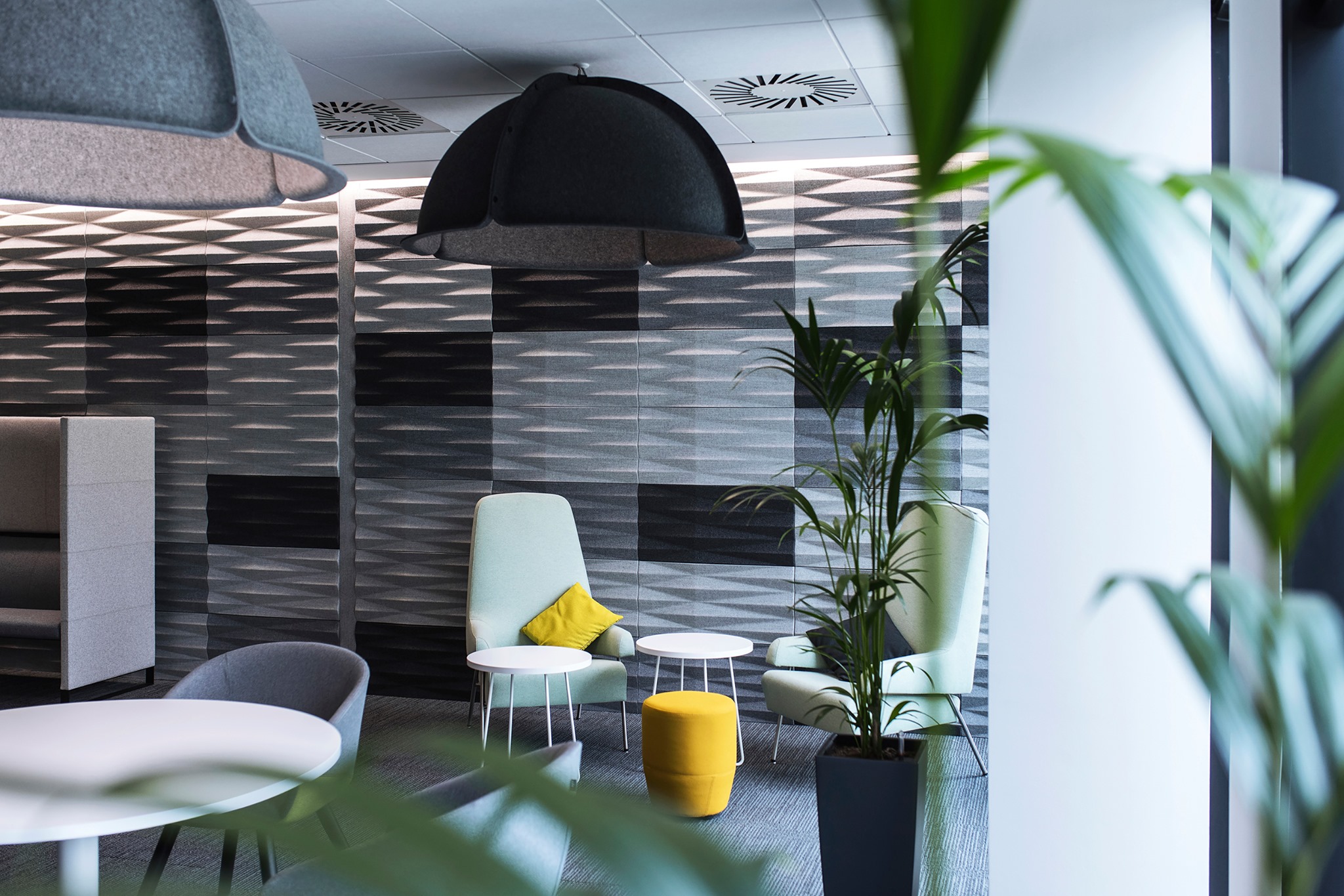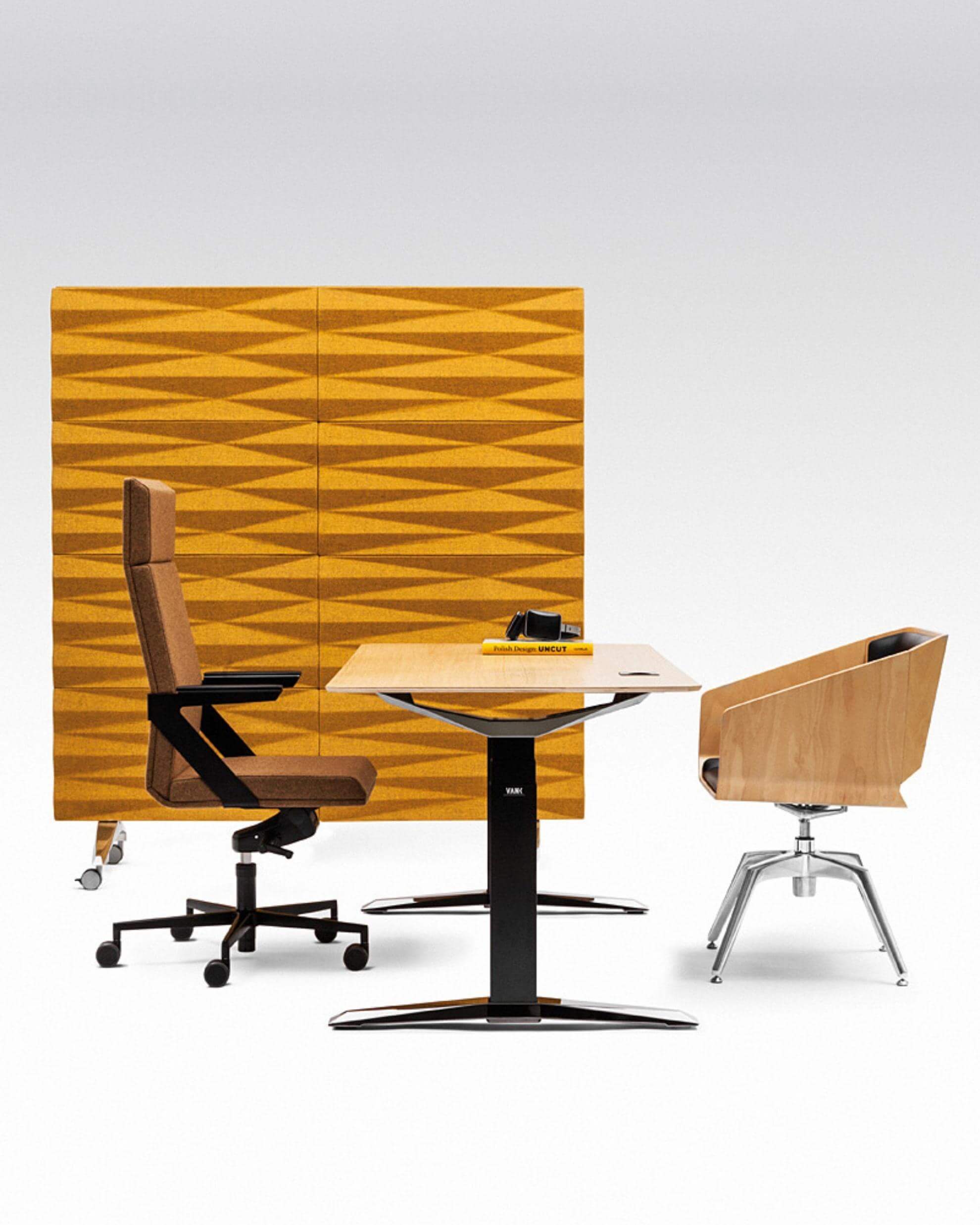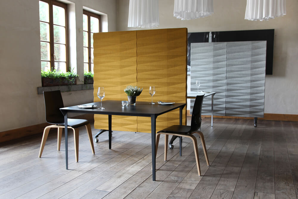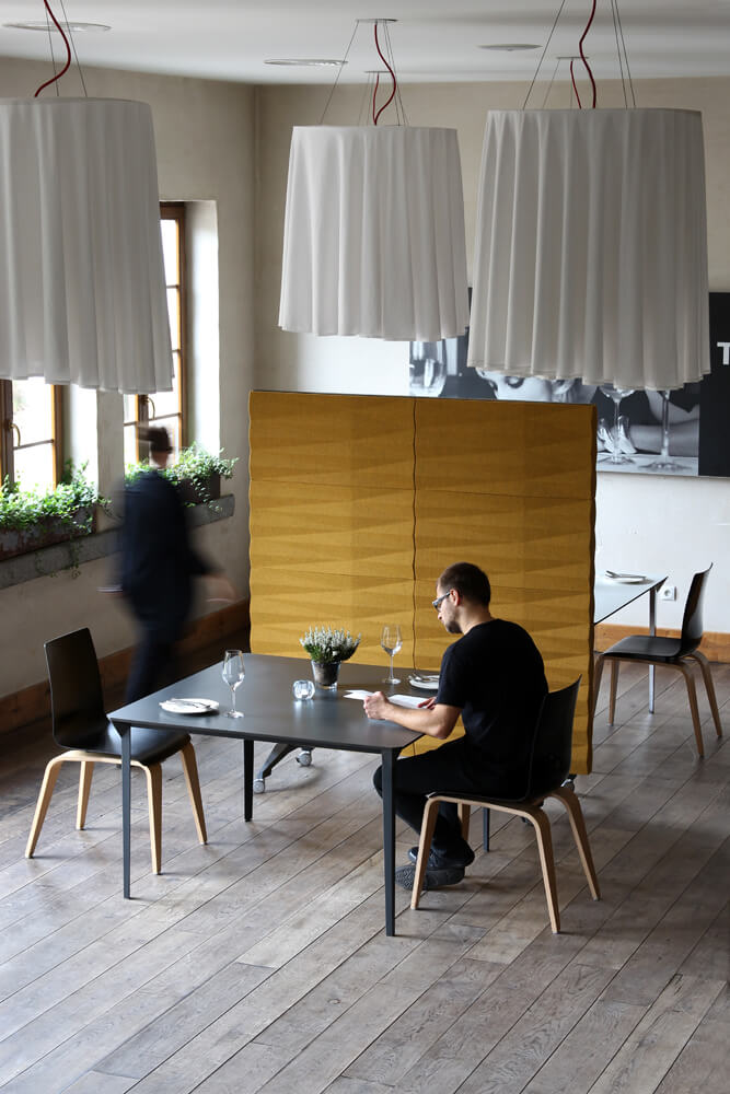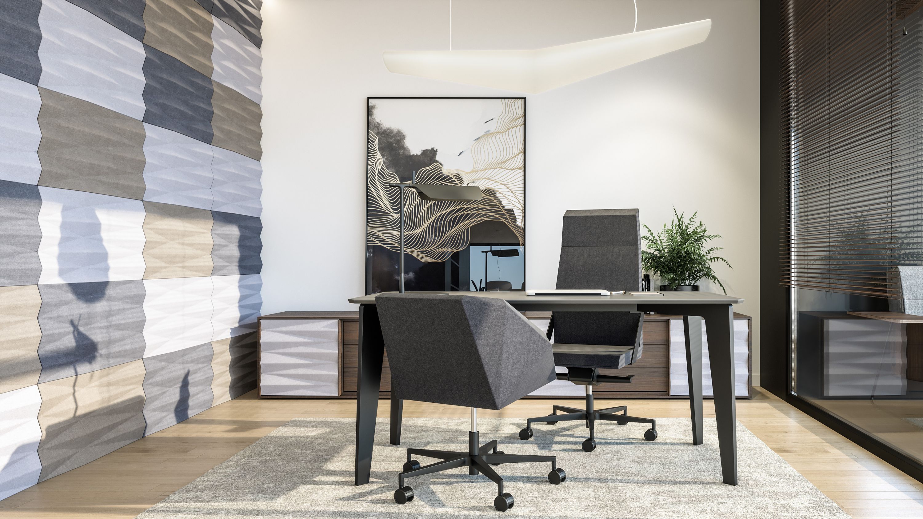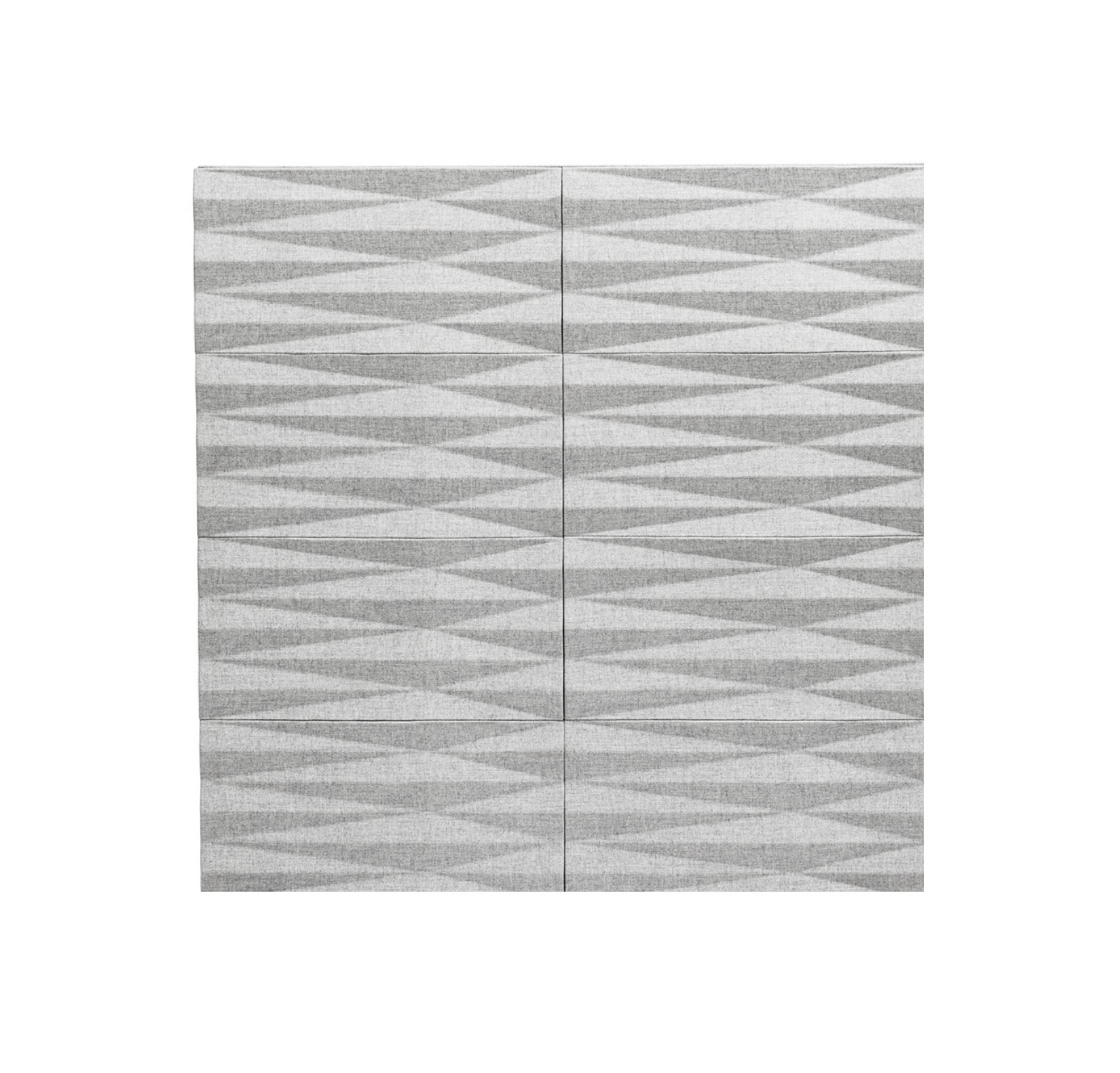 | Hinweis: | Die Akustikpaneele können frei konfiguriert werden, um kreative Gestaltungslösungen für Büros, öffentliche Räume und private Wohnungen zu schaffen. Aus denen lassen sich beeindruckende Akustikbilder mit den Abmessungen von 160 x 240 cm gestalten, die sowohl vertikal als auch horizontal aufgehängt werden können. Die geometrische Diamantenform wurde 2016 mit dem internationalen IF Design Award ausgezeichnet. |