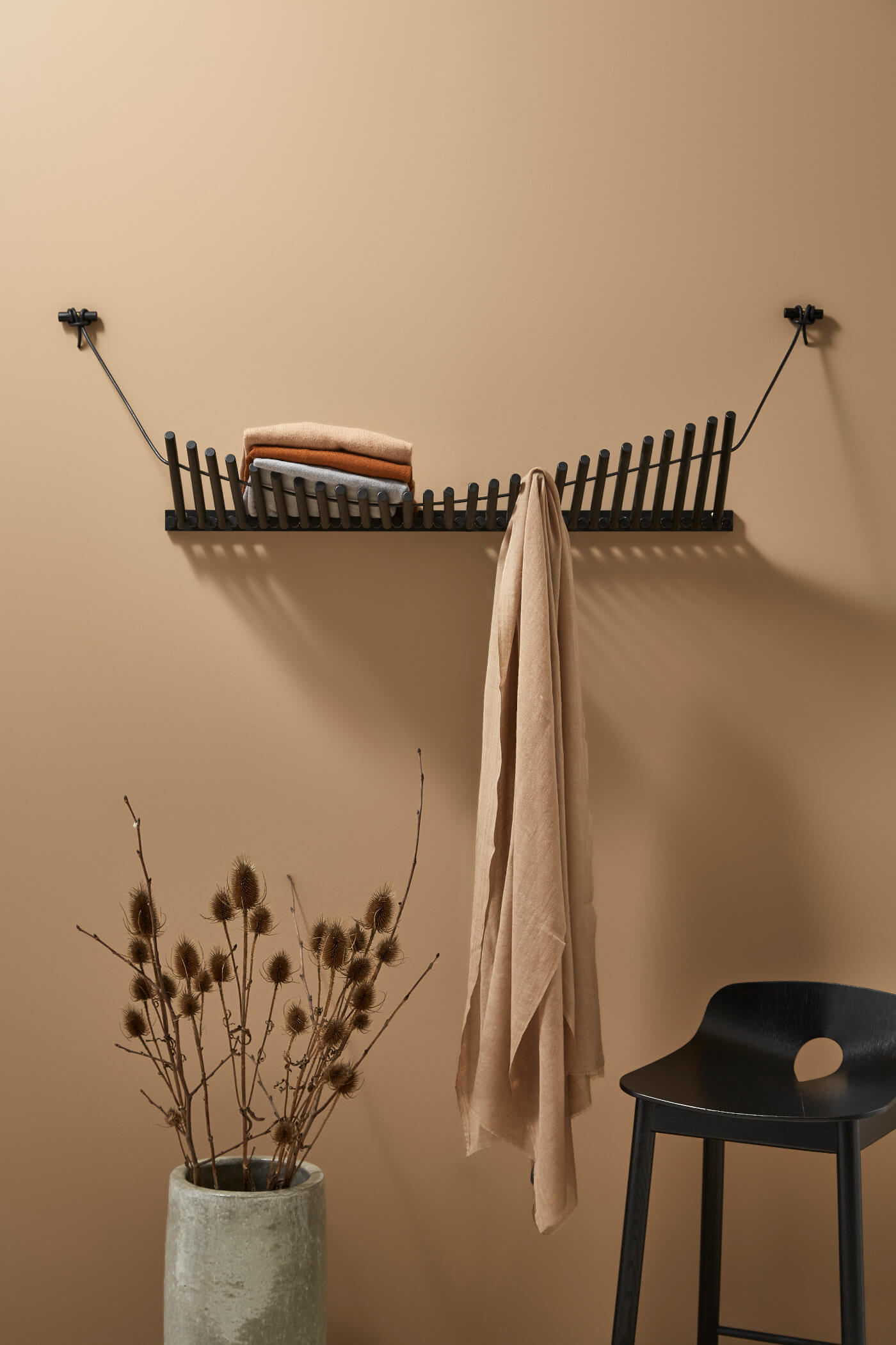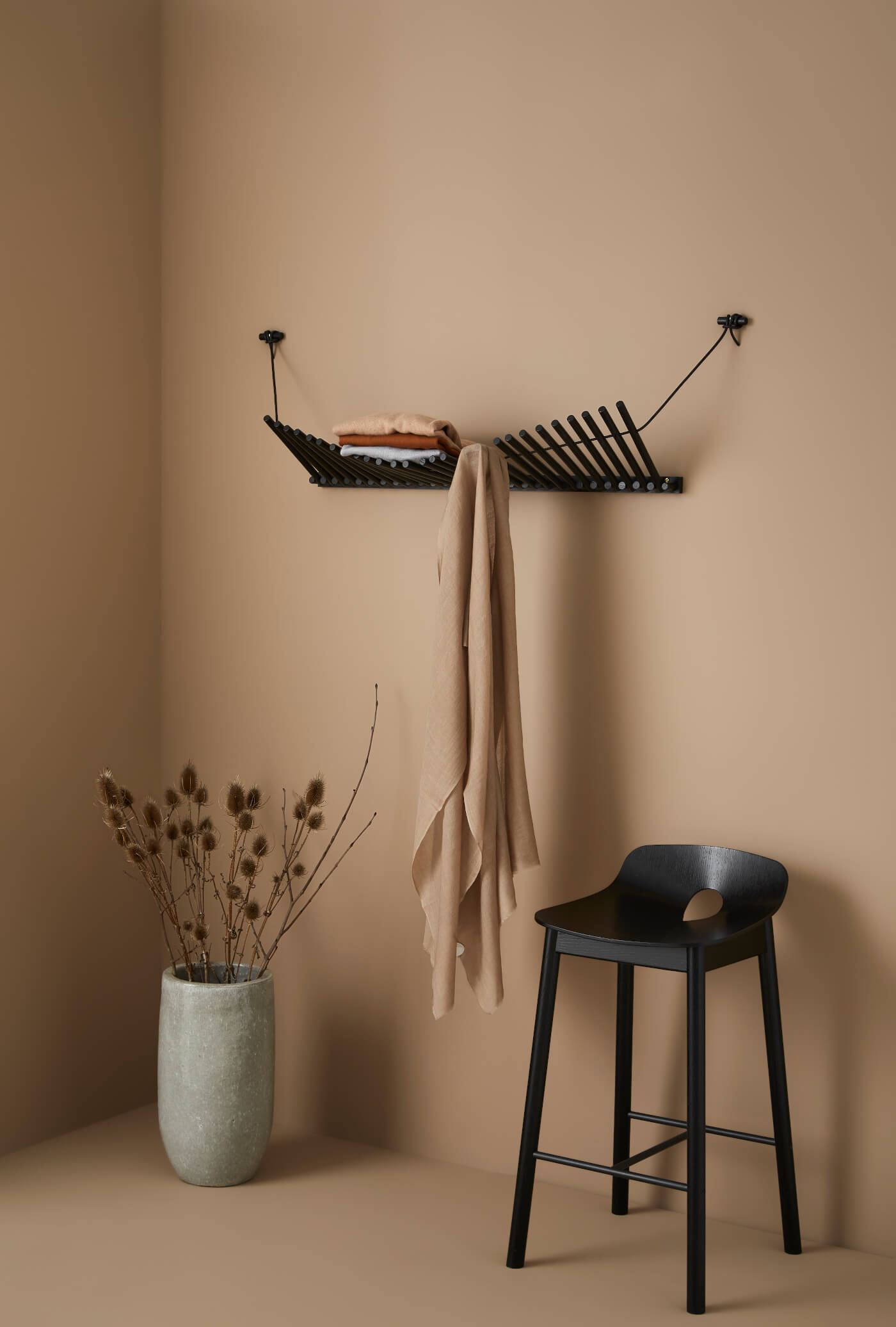 Mit der Knaegt Wandgarderobe von Woud hält ein ästhetisches Statement Einzug in jede anspruchsvolle Wohn- oder Arbeitsumgebung. Das fein abgestimmte Zusammenspiel aus schlichter Form, hochwertiger Materialität und durchdachter Funktionalität bestimmt ihre Erscheinung. Sanfte Linien, natürliche Strukturen und ein reduziertes Design verströmen subtilen Luxus – raffiniert im Detail, zurückhaltend im Ausdruck. In sorgfältiger Handwerkskunst entstehen so Wandgarderoben, die Leichtigkeit und Beständigkeit harmonisch verbinden. Filigran und zugleich robust akzentuiert die Knaegt Wandgarderobe Wände mit nordischer Eleganz. Sie scheint zu schweben, unterstreicht den Charakter des Raums und setzt Jacken, Mäntel oder Accessoires stilsicher in Szene, ohne den Blick auf das Wesentliche zu verstellen. Konstruiert aus massiver, geölter Eiche und pulverbeschichtetem Stahl misst die Garderobe 100 Zentimeter in der Länge sowie 12 Zentimeter in der Tiefe. Die fünf schwenkbaren Haken bieten Flexibilität und individuelle Nutzungsmöglichkeiten. Entworfen wurde die Knaegt Wandgarderobe vom Designer Rikke Palmerston, erhältlich in verschiedenen, dezent abgestimmten Farbkombinationen.Knaegt Wandgarderobe – Handwerkliche Perfektion und skandinavische Leichtigkeit