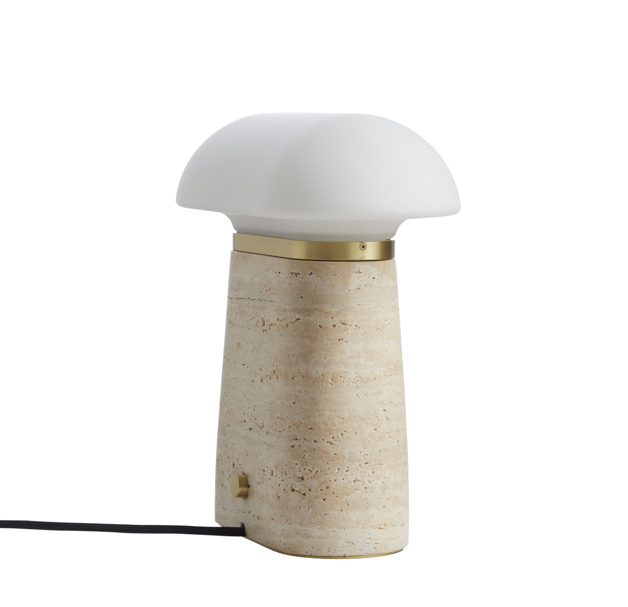 | Material: | Sockel aus Travertin mit Opalglasschirm und Messingdetails. |