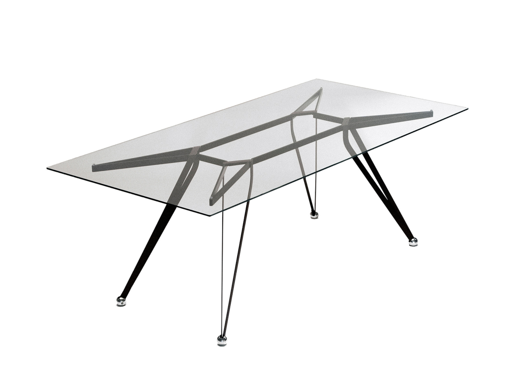 Das auffällige Fußgestell ist zweifarbig gestaltet und besteht aus einer Querkonstruktion aus schwarzbraun lackiertem Stahl. Dieses ist genau unter der Tischplatte angebracht. Die vier außergewöhnlichen Tischbeine aus Edelstahl enden am Boden in Aluminiumkugeln. Durch die transparente Tischplatte aus Kristallglas kommt das Fußgestell besonders gut zur Geltung. Der in Italien hergestellte rechteckige Esstisch Anonimus ist zerlegbar und hat die Maße 200 cm x B 100 cm x H 74 cm - die Dicke der Tischplatte beträgt 10 mm. Auch erhältlich in der runden Variante. Ein wahres Meisterwerk, das jedem Raum die gewisse Extraklasse verleiht.