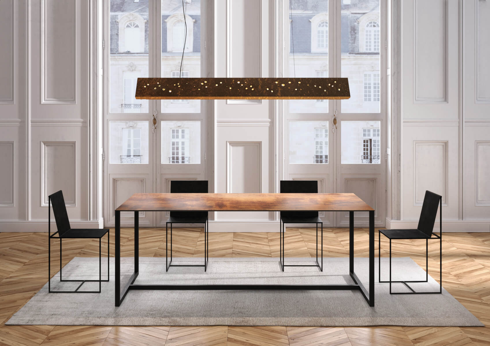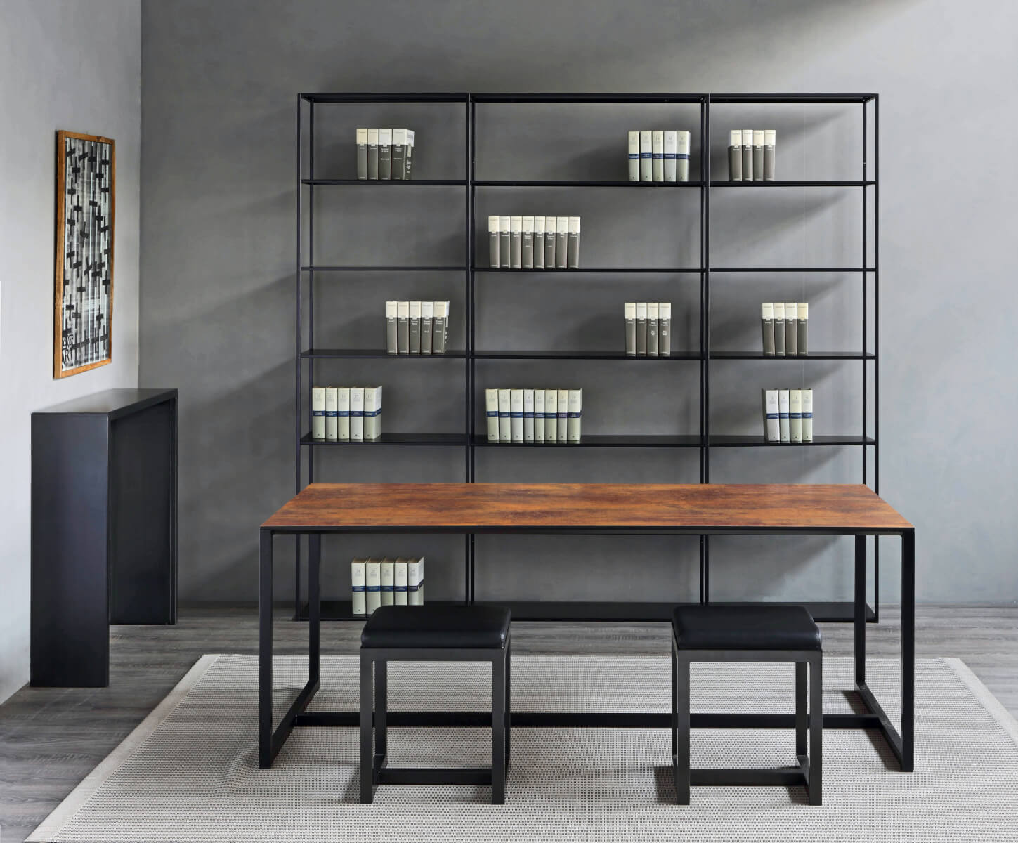 | Material: | Gestell aus Vierkantstahlrohr 35 x 35 mm, epoxylackiert kupferschwarz mit Sandeffekt. Auflage aus HPL schwarz, 10 mm stark, mit schwarzen Kanten. |