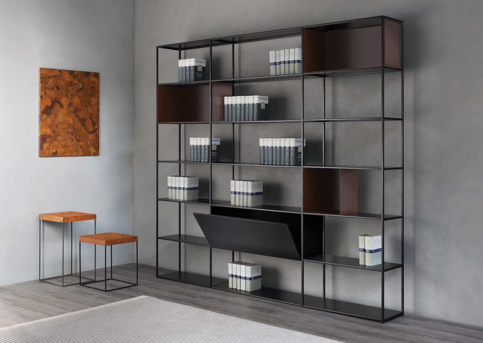 Das Easy Irony Bücherregal der Marke Zeus, gefertigt in Italien, ist ein äußerst elegantes und minimalistisches Bücherregal. Es besteht aus Metall, aus einer Konstruktion, die sich kinderleicht zusammenbauen oder demontieren lässt.