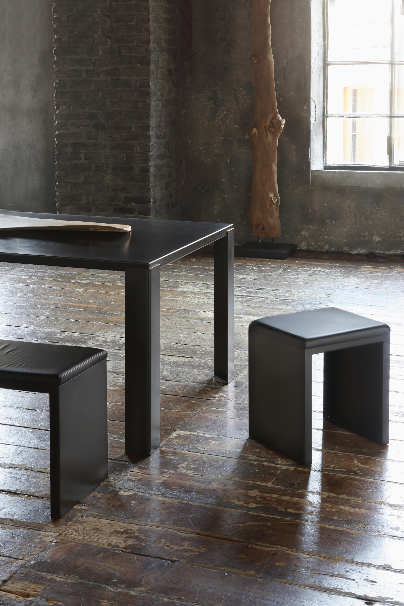 Das Gestell des Big Irony Hockers ist aus gestanztem und gebogenem Stahlblech natur. Es wurde kupferschwarz phosphatiert mit Sandeffekt. Der Hocker verfügt über einen eingesetzten gepolsterten Sitz mit schwarzem Lederbezug. Ein klassisches Möbelstück voller Eleganz, nachhaltig und schön.