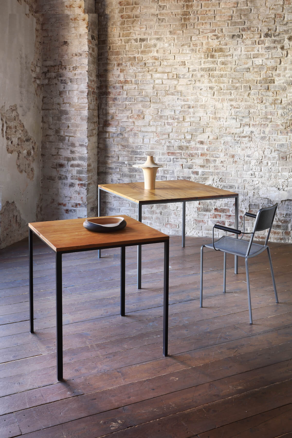 | Material: | Gestell aus Stahlrohr 20 x 30 mm, Epoxylackierung schwarz gaufriert.20 mm starke Auflage aus altem massiven Eichenholz, gespachtelt mit transparentem Akrylharz. |