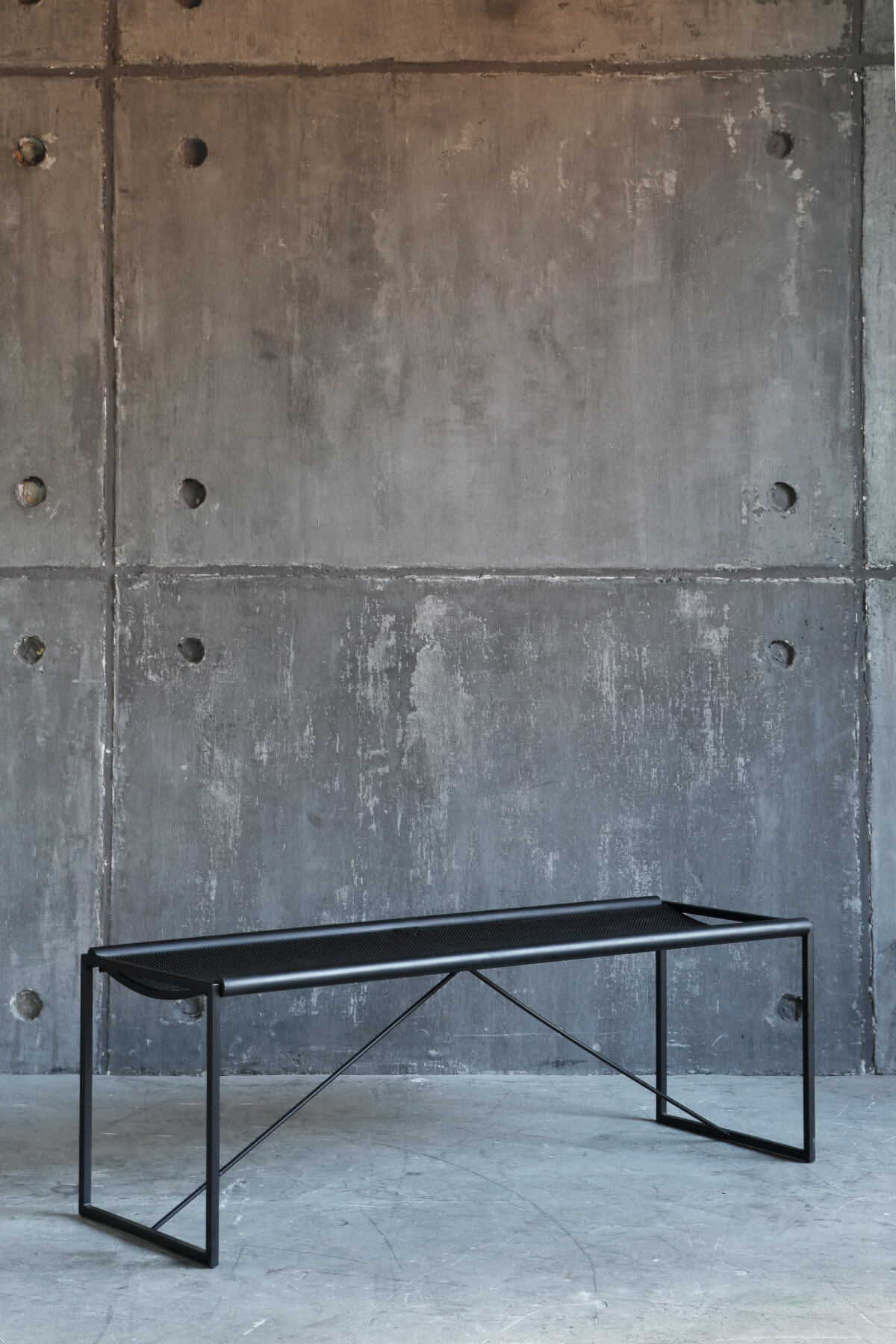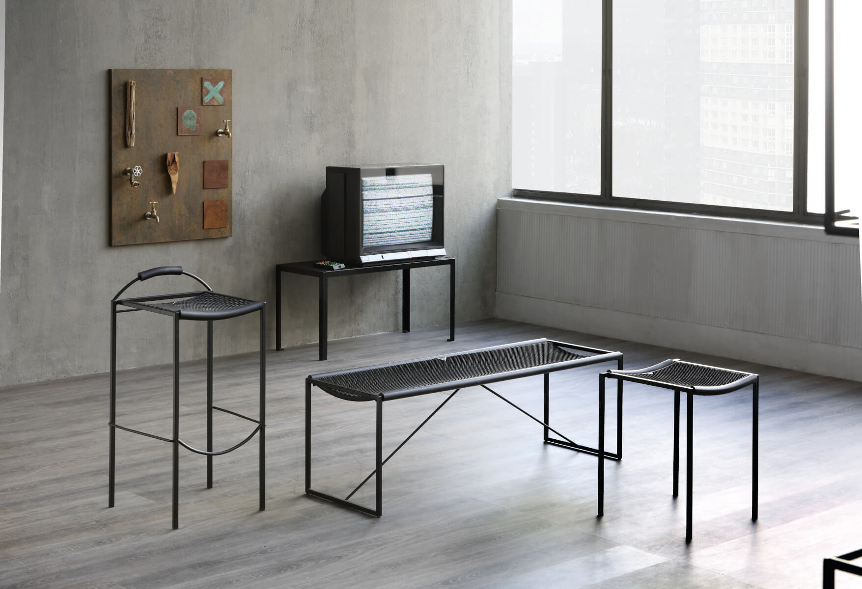 Das Gestell der Panca Bank ist aus Vierkantstahlrohr. Es wurde schwarz gaufriert und epoxylackiert. Die Bank verfügt über einen Sitz aus Gumminoppen mit schwarzem extrudierten Gummi. Ein klassisches Möbelstück voller Eleganz, nachhaltig und schön.