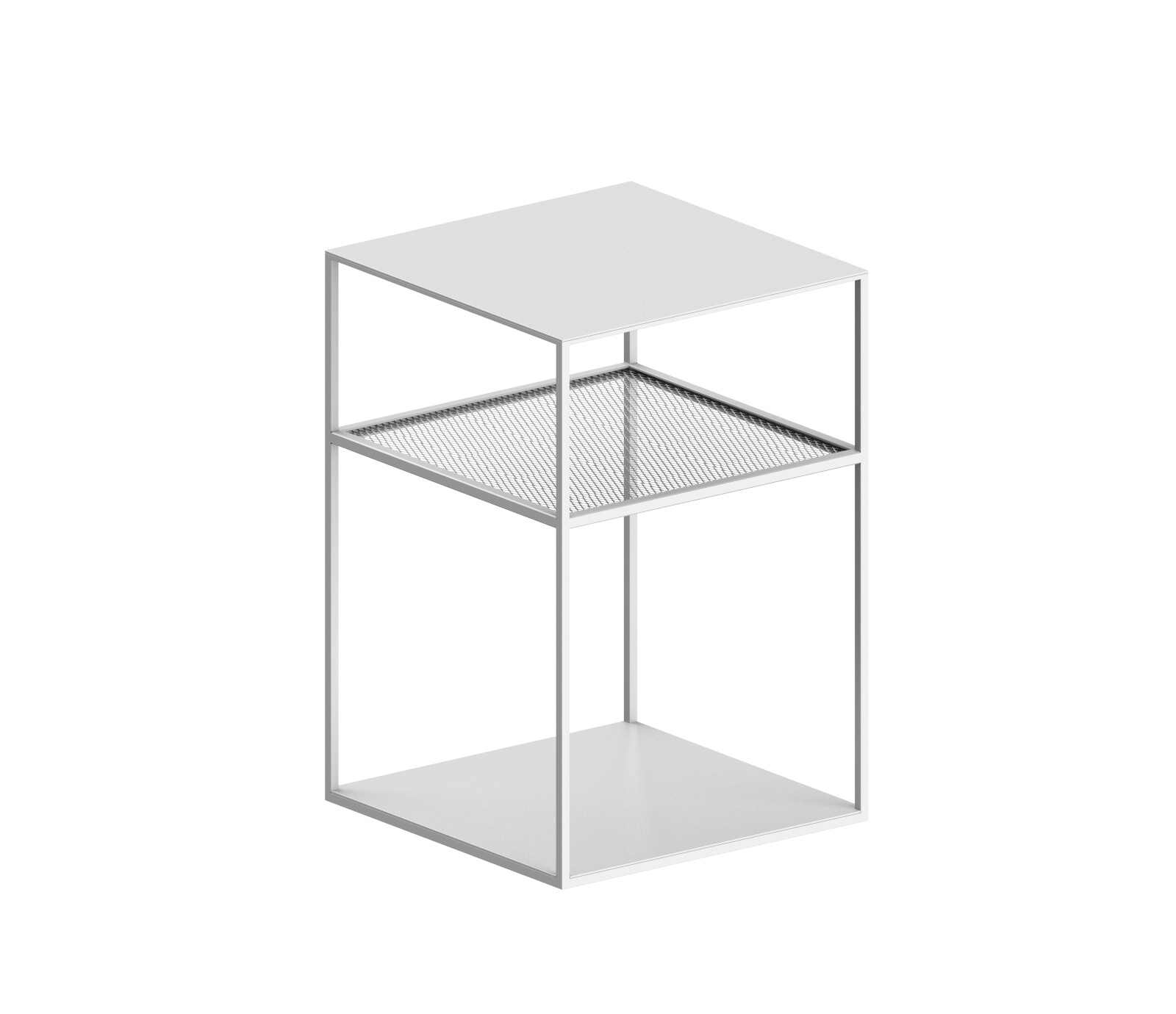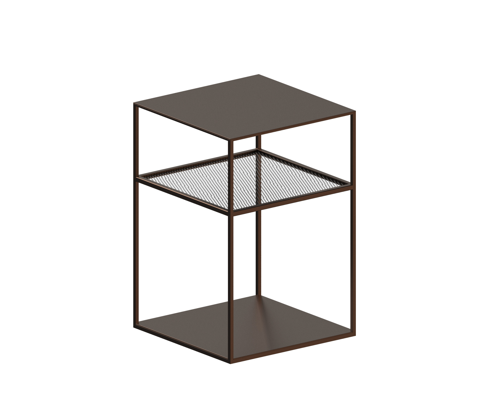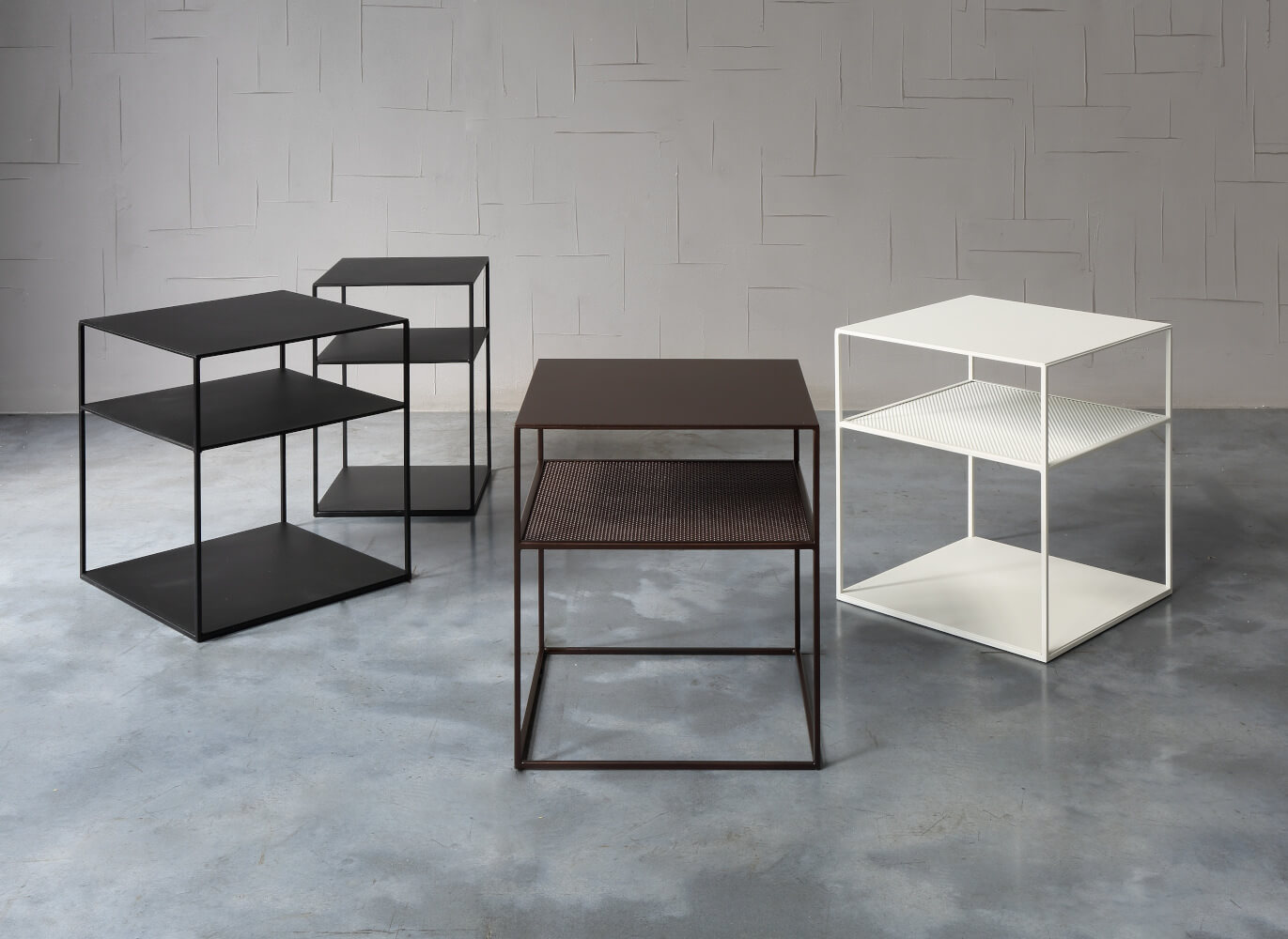 | Hinweis: | Mittleres Regal aus Streckmetallgeflecht, 15 cm unter der Oberplatte. Das untere Regal ist nicht verschweißt und abnehmbar. Epoxidbeschichtung in Kupferschwarz Sand-Touch, geprägtem Weiß oder Metallbraun. |