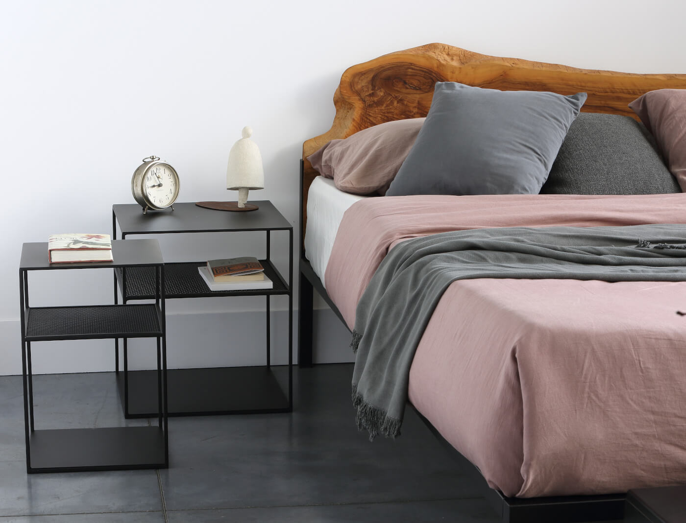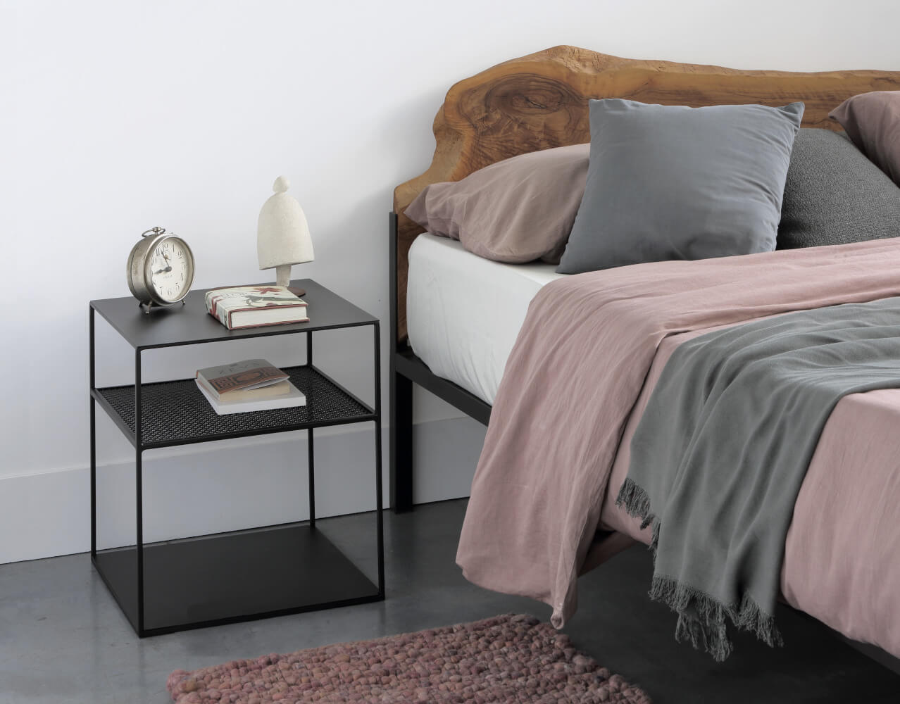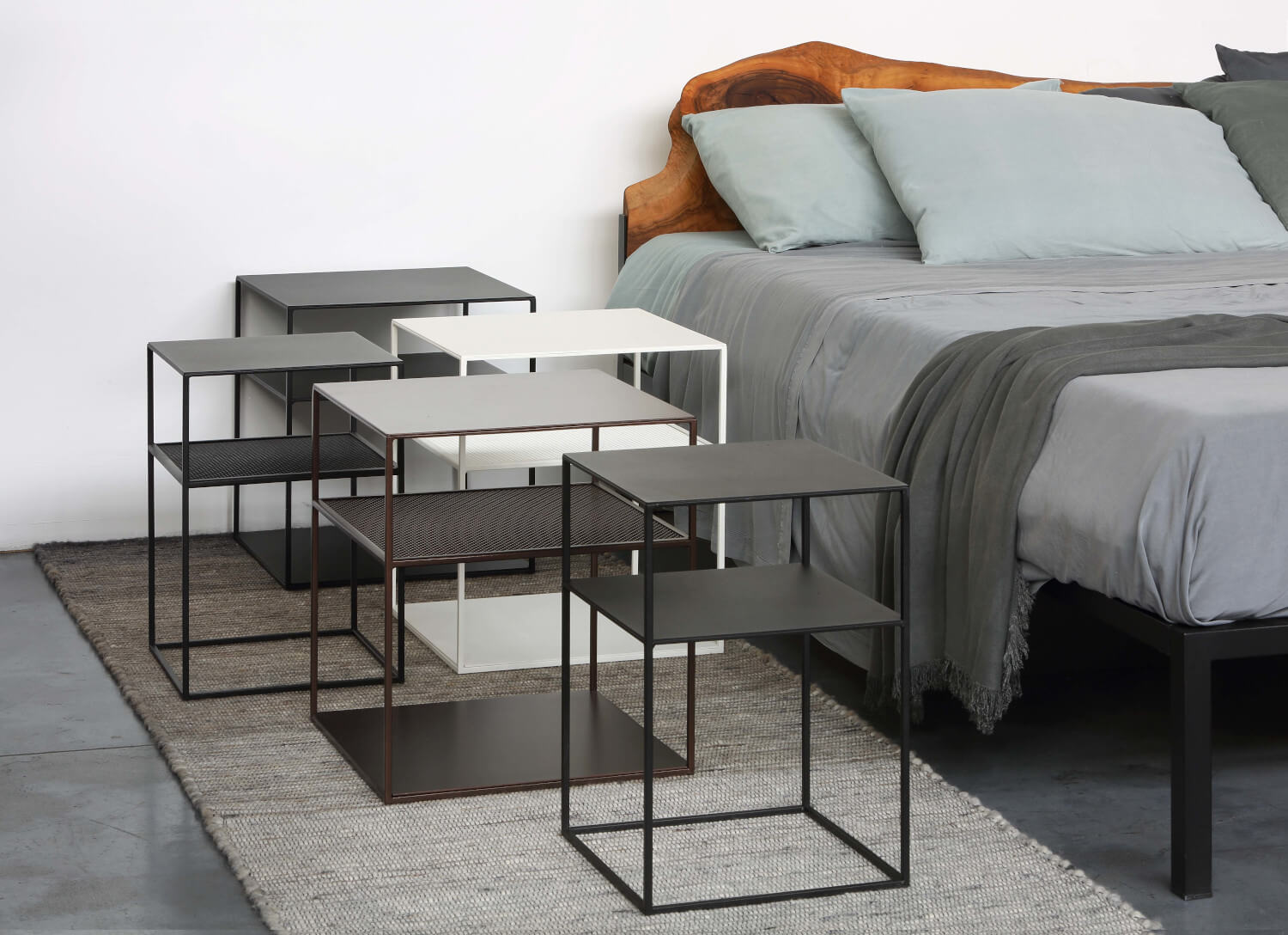 | Hinweis: | Mittleres Regal aus Streckmetallgeflecht, 15 cm unter der Oberplatte. Das untere Regal ist nicht verschweißt und abnehmbar. Epoxidbeschichtung in Kupferschwarz Sand-Touch, geprägtem Weiß oder Metallbraun. |